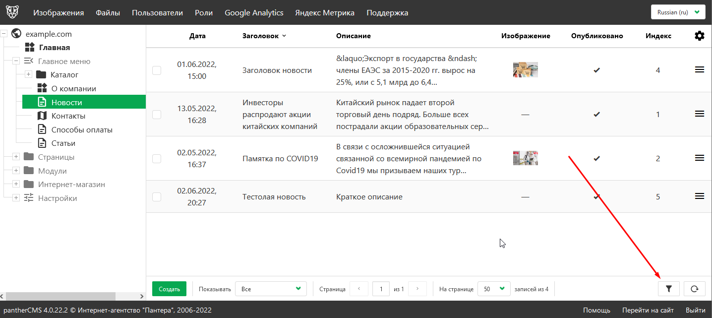 Кнопка вызова фильтров