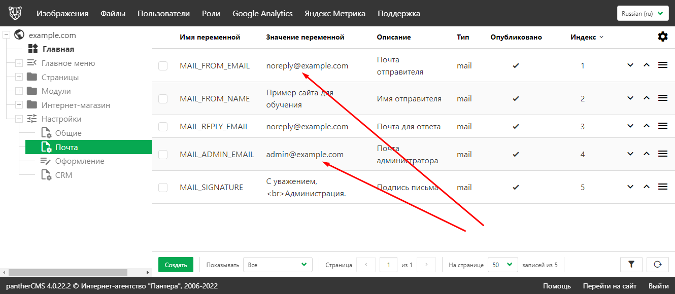 Настройки почты
